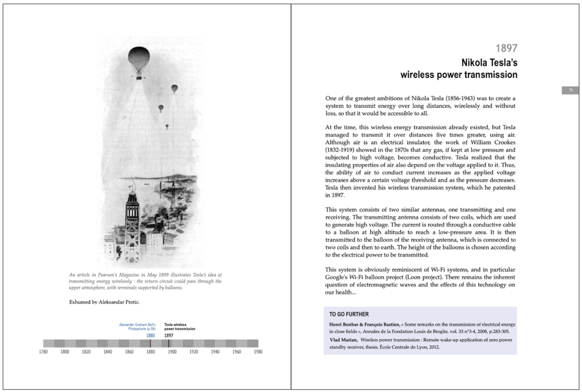 Each story is displayed as a double page, including a short text with anecdotes as well as an illustration and some sources to explore further.